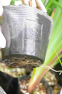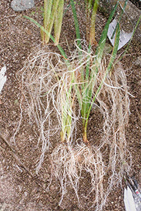 水で洗ってみると、右の写真のように、左から右にいくにつれ、地上部の葉の成長速度が大きくなるほど、発根状態がすぐれています。注目すべきは、白色の太い根がどれくらいあるかが一番のポイントになります。
