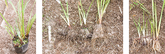 これらの株を鉢から出してみると、真ん中の写真のように、根の張り方に違いが生じています。