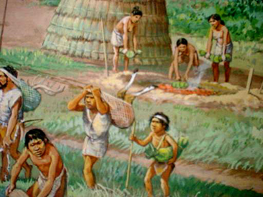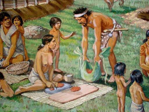 次にまえもって穴(あな)の中でたくさんの石ころをやいておき,そのあつあつの石の上にさきほどの肉をくるんだつつみをのせます.最後に土をかぶせて2〜3時間まちます.この絵ではむこうで蒸焼き(むしやき)の準備(じゅんび)をしていますね,手前の男の子はできあがった料理を運んでいます.その前を男の人がかりでとったシカを運んでいます.どうやら今日の料理は「シカの蒸焼き香草くるみ縄文風」ですね・・・この料理は縄文時代のすべての時期に行われていました.よほどおいしかったのでしょう.君たちも食べたいと思いませんか・・・