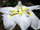 | 花被片 | : | 純白色地に六英花で、左右の花被片が整う「正花」で、花径は20cmを超える大輪の品種です。花の中心部、花柱枝から雄蕊が突出して「働き花」になる場合があります。アイの基部は緑色がかった黄色で、花被片の先端部にいくにつれて黄色くなり、細長く、先端部は3〜5本が筋状となって花被片の中間まで達する場合があります。 |