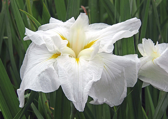 | 花被 | : | 白色の地に細かい筋が入ります。遠目にはやや緑色がかった黄色いアイが細長く、目立ちます。 |