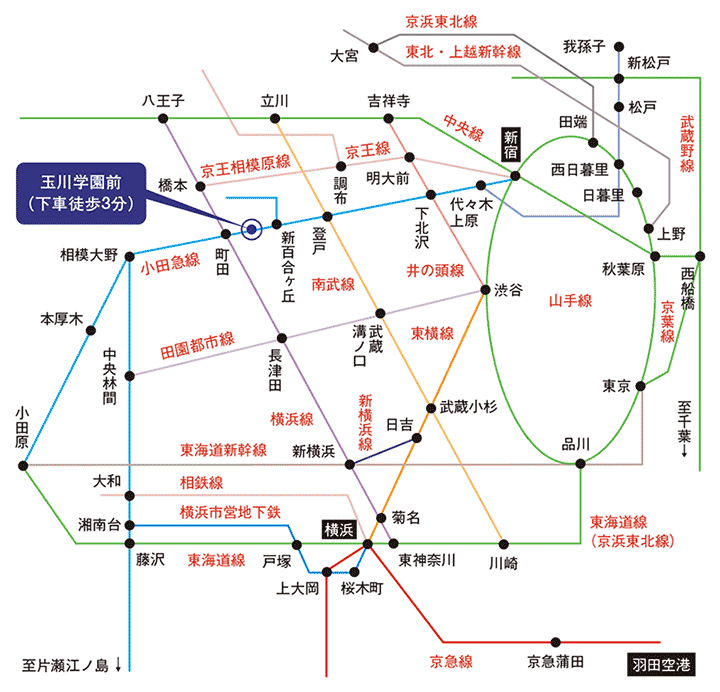 小田急線玉川学園前は町田の隣駅。一駅で繁華街に。新宿、下北沢、新百合ヶ丘、厚木、海老名、小田原、藤沢は同じ小田急線でアクセスも簡単です。