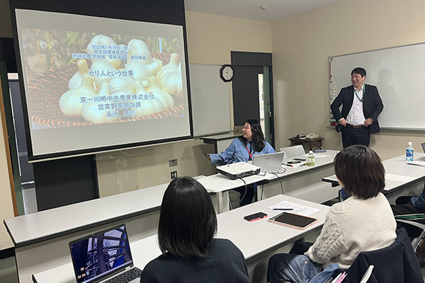 今回は、川崎市北部市場で青果物の卸売を行う東一川崎中央青果株式会社よりお越しいただき、組織や業務概要の紹介、および2023年卒で現在は営業部門の野菜部にてセリ人として活躍する卒業生より、担当品目であるニンニクを例に生産地から市場〜店頭までの流れ、やりがいなどをお話しいただきました。