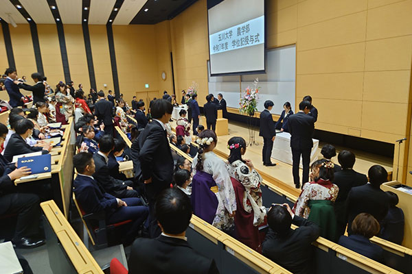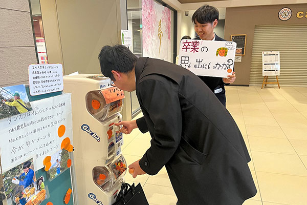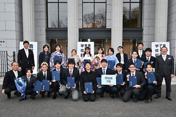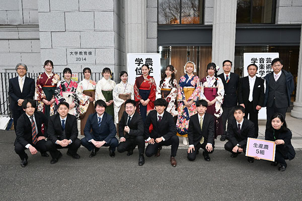 2026年3月13日(金)に玉川大学で卒業式が行われました。卒業式後に学部ごとに行われる学位記授与式では、学生一人一人に学位記が手渡され、また勉学に励んだ学生には学部長賞の授与も行われました。浅田農学部長からは4年間の頑張りへの労いと、卒業後もいつでも玉川の丘に訪ねておいでと、温かい言葉がかけられました。来場された保証人の方々も学生たちの門出を嬉しそうに見守っていました。授与式の後は領域ごとに分かれて記念撮影の時間も持てました。また、農学部公認の有志団体である園芸班と農場太鼓のメンバーも参集し、園芸班は、南さつまキャンパス清原園で生産されたタンカンを入れたガチャガチャ(通称:タンカンガチャ)の設置を、農場太鼓は、大学6号館の前で演奏披露をと、それぞれ卒業生の門出を祝いました。
