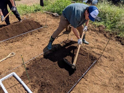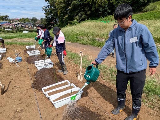 生産農学科1年生は、秋学期に「フィールド実習A」で秋冬野菜(ダイコン・カブ・コマツナ・ホウレンソウ)を栽培します。これらの野菜の栽培を通して、栽培管理や農機具の使い方を学びます。第1回目の実習では、ダイコンやカブを栽培する各自のほ場を作りました。剣先スコップや平鍬を用いて、耕起、均平作業、施肥(堆肥・化成肥料)を行い、畝を立てました。高畝や平畝など、学生一人ひとりがどのように栽培すると効率的か、大きい野菜を生産できるかを考えながら作業を行いました。収穫に向けて、日々の授業の合間も使い、栽培管理を進めていきます。また、次回の実習に向けて、プランター栽培の準備も進めていきました。どのような野菜が生産できるか楽しみですね。