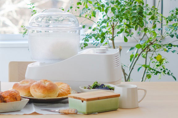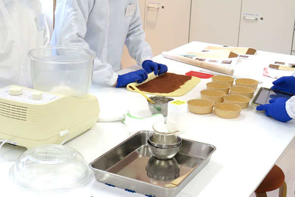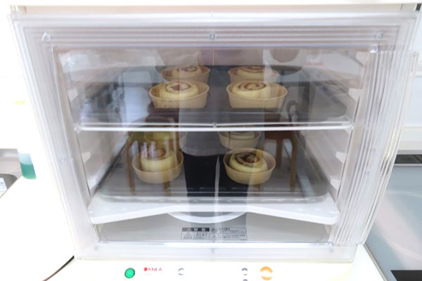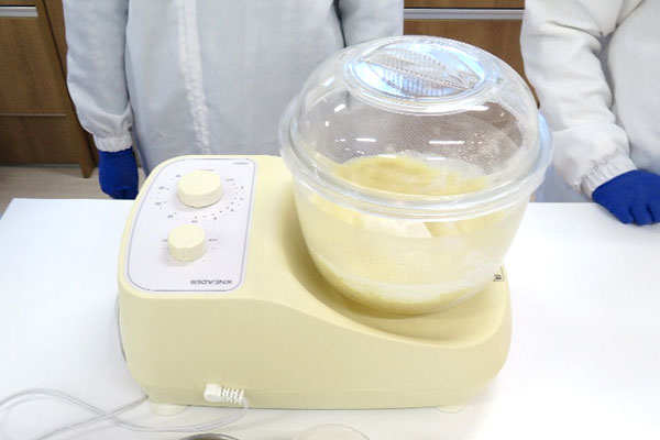 実習では日本ニーダー株式会社の「パンニーダー」、「発酵器」を使用し、シナモンロールを作りました。パンニーダーは材料を投入し、スピード調節、タイマー設定をするだけで、簡単に生地がこね上がります。またポット(容器)が透明のため、生地の変化を容易に観察することができます。発酵器は、洗えてたためて持ち運べることが大きな特徴です。企業の製品開発にはユーザー視点での工夫や改良などが取り入れられています。