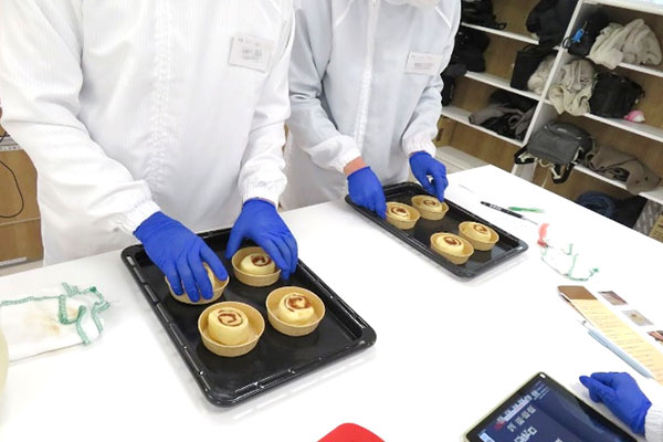 シナモンロールは、とても良い香りで、焼きたてパンの美味しさをかみしめ、パン作りの楽しさも実感しながら試食しました。学生は今回の実習を通して製造機器やパン製品など様々な気付きに触れたと思います。日本ニーダー株式会社様、ありがとうございました。