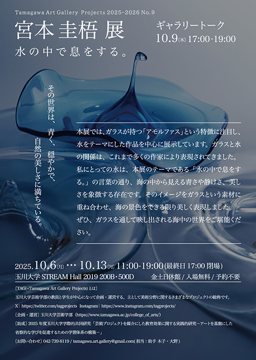 Tamagawa Art Gallery Projectsでは、10月6日(月)より、玉川大学芸術学部アート・デザイン学科3年の宮本圭梧による、ガラスを用いて「水の中で呼吸する。」をテーマとした展示をいたします。また、アートを主軸としたテーマでフリートークを行うトークイベントを初日、10月9日(木)に行います。予約不要、入場無料です。ぜひご来場ください。