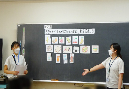 | 3年生 | ねらい:相手の好きな食べものを知るために英語で聞く方法を知ること。 内 容:「はらぺこあおむし」の絵本を通して食べ物の表現に慣れ親しみ、学んだ表現を使って給食当番ゲームを行う。 |