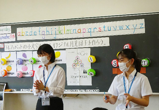 | 4年生 | ねらい:オリジナル月見団子を作ってアルファベットの小文字に慣れ親しむこと。 内 容:体を動かしながらアルファベットの小文字について学習活動をし、(十五夜にちなんで)オリジナルのカラフルな月見団子を作る活動を行う。 |