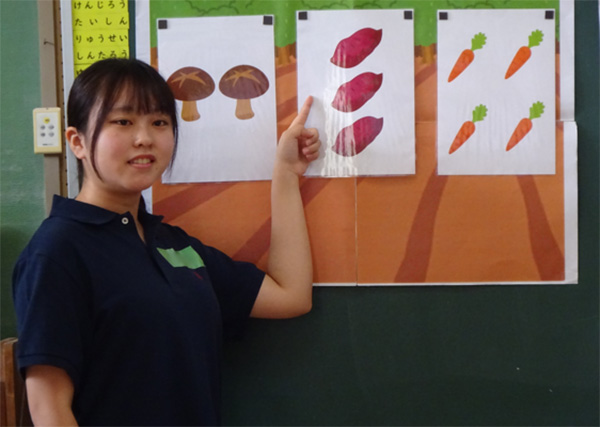 | 1年生 | ねらい:全4種の野菜(turnip, carrot, potato, onion)について、それぞれの英語での言い方を理解させる。 ・ペープサートを用いて絵本「The Giant Turnip」を読み聞かせたうえで、オリジナルストーリーを通して身近な野菜の英語に親しませる。 |