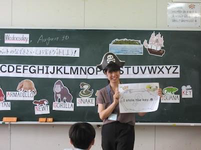 | 5年生 | ねらい:アルファベットの大文字を活字体で書けるようにする。 ・全員で海賊になりきり、アルファベットを様々な側面から学ぶ。宝箱を開けるため、アルファベットの謎を解いて丁寧に書かせる。 |
