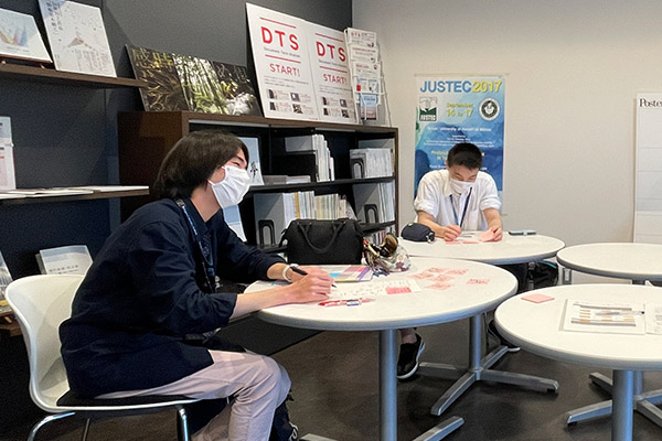 スタートの地点から、グループでポストイットにアイデアを書き出し、自分たちで方向性を決定しました。はじめはある程度のことは決まっていて、それに沿って活動するものだと勘違いをしていましたが、自分たちで活動を見出していくということが必要だとわかり、やる気が出てきました。その後具体的な内容や計画を練り、先生方に発表など、「こんなにステップを踏まなければならないのか」、と大変に思う反面、「自分なりにできて楽しいな」、とも感じることができました。その後も、アンケート調査、取材交渉、取材の実施、動画の撮影、記事作成など、言ってしまえば1~10、DTS さんのお力をお借りしながらですがここまで活動してきました。特にこのことを感じたのは取材交渉をしている時です。普段学校で生活している限り、誰か外部や上級生に丁寧にお願いをし、交渉をするということはまずありません。使ったことのない言葉、会ったことのない人への連絡など、初体験がたくさんありました。何回か連絡ミスやトラブルもありましたが、無事に取材終了までこぎつけることができたので、今では良い思い出です。