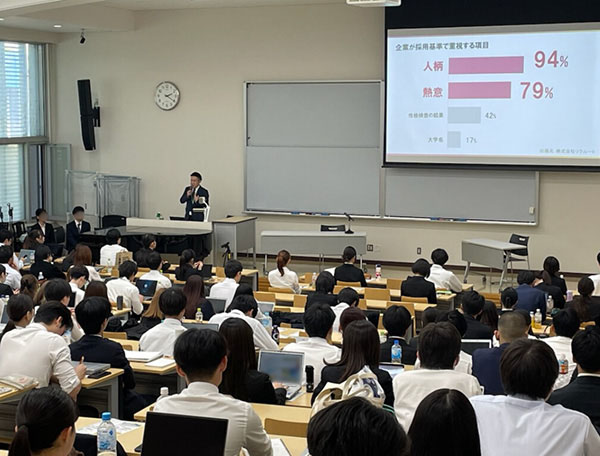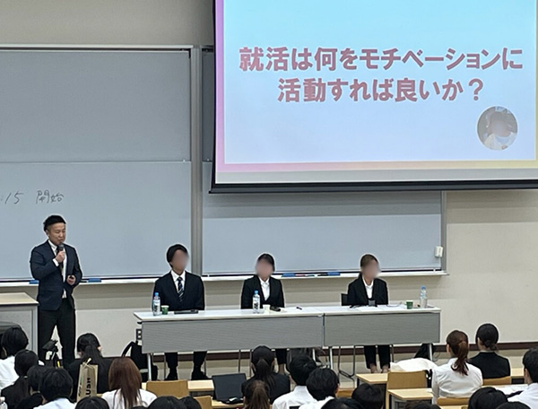 キャリア研修では、SHOW就活株式会社代表取締役・矢部敏希氏に昨今の就職活動や業界の状況、また今後のキャリア形成を見据えた就職先の決定について、講義をしていただきました。また、3年生による就職活動の模擬実践、4年生や卒業生からの就職活動体験談、卒業後のキャリア形成についてのパネルディスカッションも行っています。