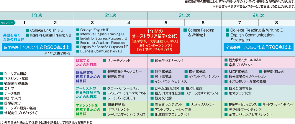 - 1年間の留学期間中、前半は留学先の大学付設の語学学校で、後半は大学の学部で、世界中の国々から集まった学生と共に英語力を伸ばします。さらに、現地での就業体験ができる「海外インターンシップ」、選択したテーマを深掘りする「自主研究」にも取り組みます。このような充実した内容の留学を含めて4年間で卒業できることが特長です。