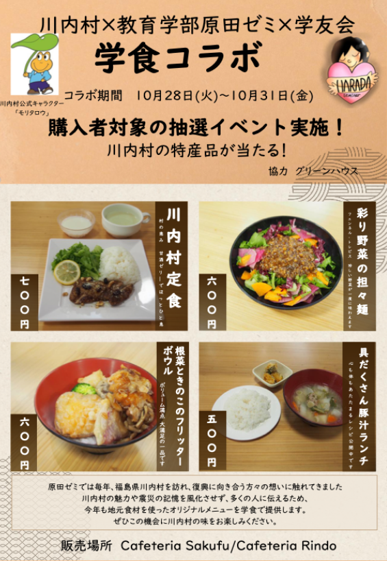 今年度も、福島県双葉郡川内村で大切に育てられた、新鮮で美味しい食材を使用し、学食コラボを実施しました。