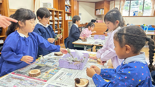 自然に触れながら生まれる驚きや発見、そして心に残る体験。一本の木の枝や一輪の花が、子どもたちの大切な学びと記憶につながっています。