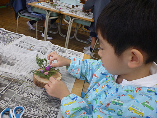 そこで、作品には入学式のお花のドライフラワーに加え、キャンパス内で拾ったどんぐりや松ぼっくりなども飾り付けました。子どもたちにとっての入学の思い出と、玉川の自然がぎゅっとつまった温かな作品が完成しました。