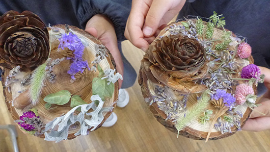 「せっかくできたドライフラワーを作品として残したい」――そう考えた子どもたちの思いと、「伐採したヒマラヤスギは今どこにあるの?」と繰り返し尋ねるほど木に関心を寄せる気持ちが結びつきました。