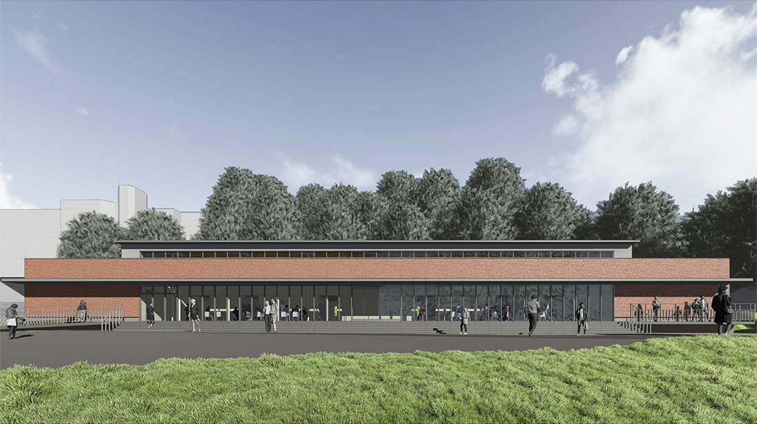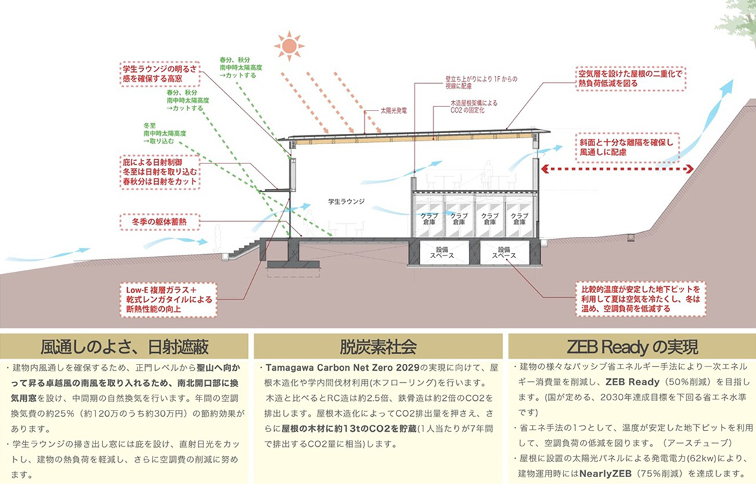 Low-eペアガラスや深い庇による日射遮蔽、自然換気システム、太陽光発電パネルなどを採用。学園内の施設で初めて「ZEB Ready」を取得予定の省エネルギー建築です。 - 外観