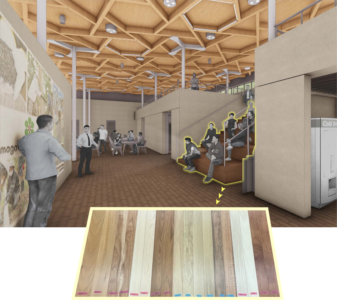 中央の階段・展示ステップのフローリングには、キャンパス内で間伐された、スギ、ヒノキ、サクラ、イチョウ、プラタナス、ヒマラヤスギ、カシ、クヌギ、シデの9種類の木材を使用したフローリングが敷かれています。樹種ごとに異なる色合いや木目、質感が現れ、歩くだけで多様な木の個性を感じることができます。