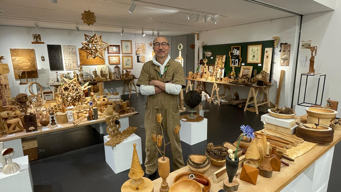 鈴木純郎先生は、「作りたいものを決めて木を選ぶ」のではなく、出会った木材や木の実の形・質感・香りなど、木そのものが持つ特性を感じ取りながら作品を生み出すアーティストです。