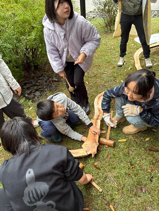 玉川学園で伐採された間伐材や、キャンパスで生まれた廃材を素材に、自然・時間・未来をテーマにした環境アートとして制作されました。
