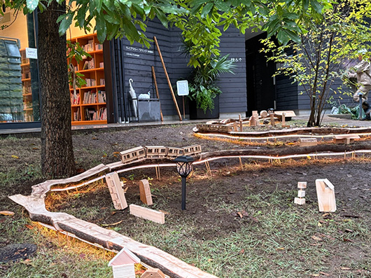 線路の周囲には、玉川学園内で出た廃材を使って作られた建物が並んでいます。