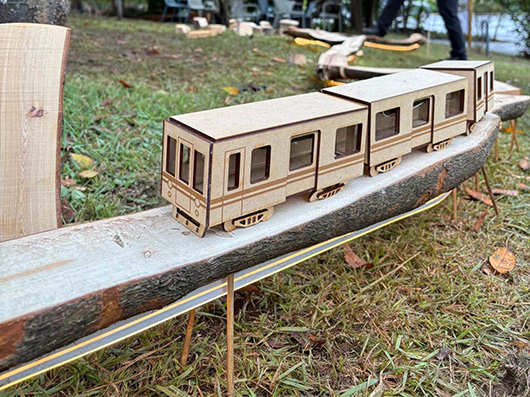 作品には、過去・現在・未来をイメージした電車がレーザー加工で作られ、線路上に配置されています。