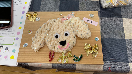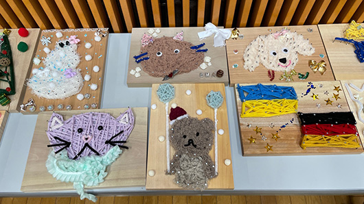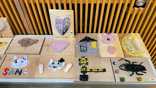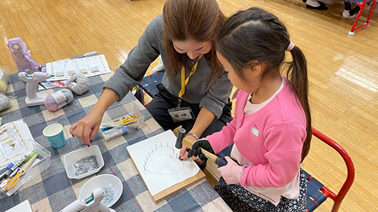 年長組では、板に釘を打ち、毛糸を巻きつけて模様を作る「ストリングアート」に挑戦しました。