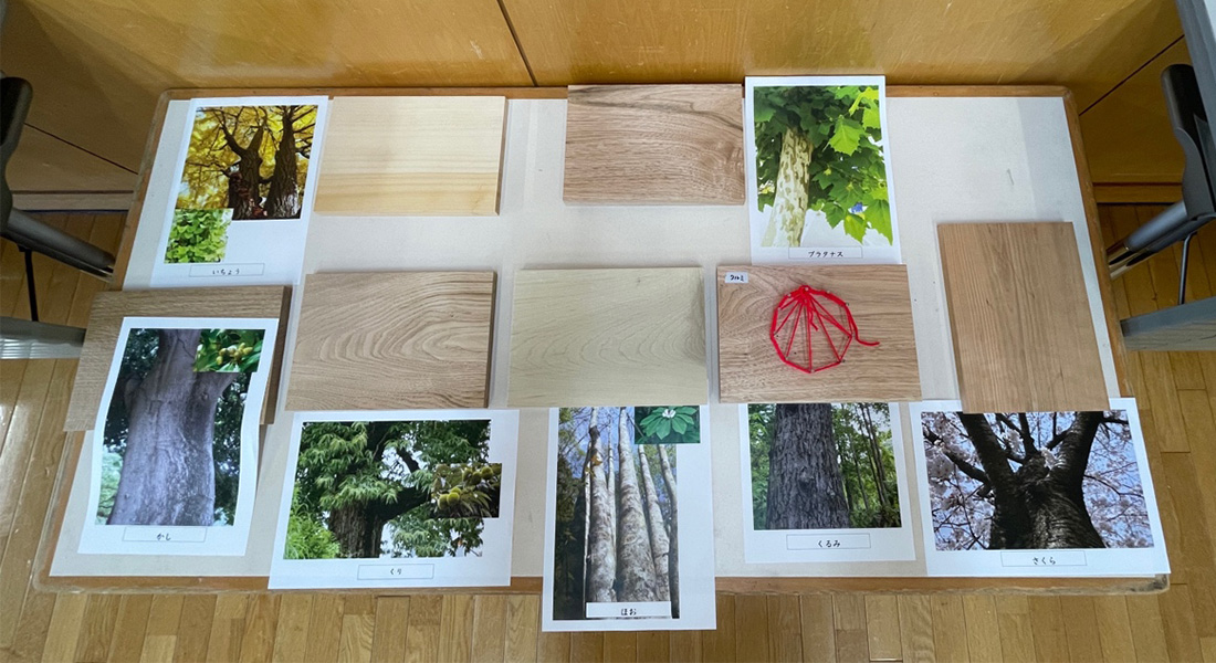 多様な木の個性を感じられるよう、板の横には伐採前の樹木の写真も展示し、子どもたちは「木材になる前の姿」にも興味を広げていました。