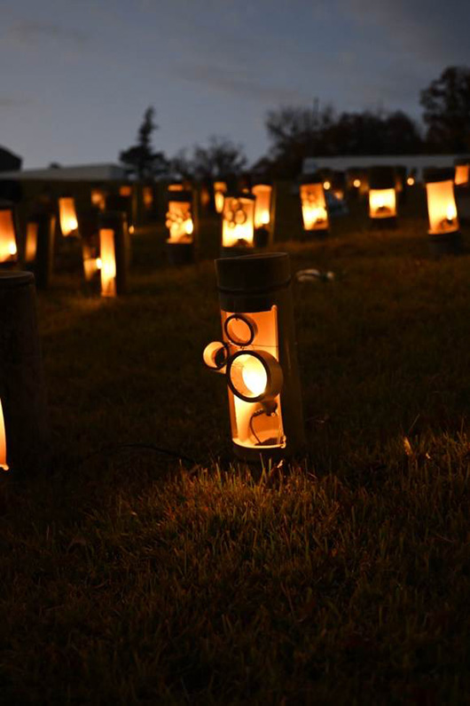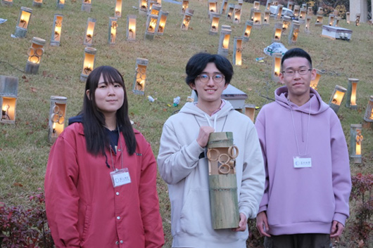 竹筒に開けられた模様はそれぞれ個性があり、光が漏れる形も異なります。この作業を通して、竹はただの素材から、夜のキャンパスで光を放つ芸術作品へと変身しました。学生たちはデザインと自然素材を組み合わせる楽しさを学び、創造力を発揮しました。