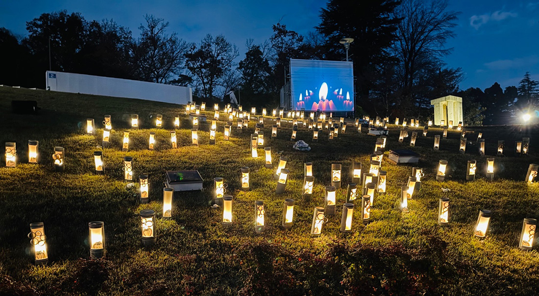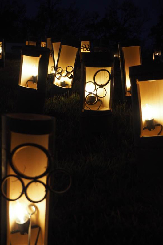竹筒ごとに異なる光の模様、緩やかな傾斜に沿った配置、背後スクリーンとの調和。竹あかりは、自然素材と人の手仕事が生み出す美しさを体感できる参加型アートです。夜の芝生に広がる温かい光は、伝統と現代アートが融合した幻想的な空間を作り出し、見る人の心を落ち着かせます。「竹あかりが描く、光と影のアート。自然のぬくもりと幻想的な夜をお楽しんでいただくことができました。