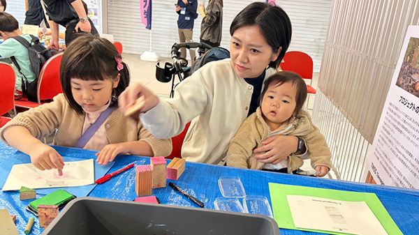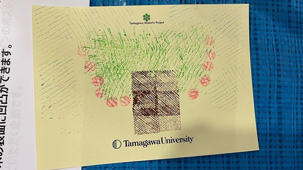 当日は、玉川大学リベラルアーツ学部永井悦子教授と学生13名が参加し、木の年輪ハンコを使ったワークショップを実施しました。