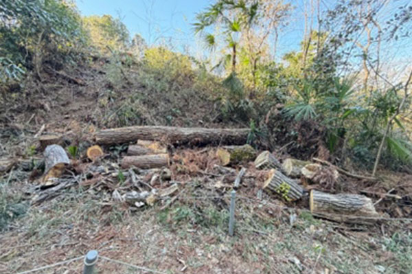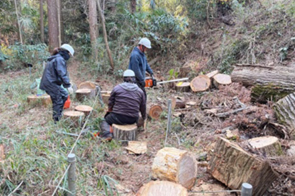 園内には、ナラ枯れの影響で伐採された樹木が残されていました。放置すれば腐食やスズメバチの営巣といったリスクもあり、研究活動への支障が懸念されていました。