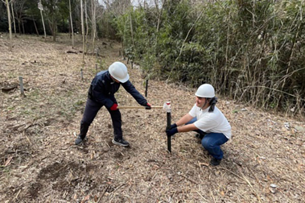 学生たちはまず、園内へ安全に入れるよう木製階段の設置に取り組みました。使用したのは、学内で間伐されたヒマラヤスギ。支柱には単管を用い、土をならしながら、一段ずつ丁寧に形にしていきました。