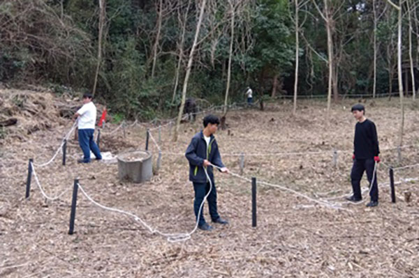 学生たちは新たに単管を打ち込み、ロープを設置。安全に歩ける通路を再びつくり上げました。人が通れる道が戻ることで、野草園は少しずつ本来の姿を取り戻していきます。