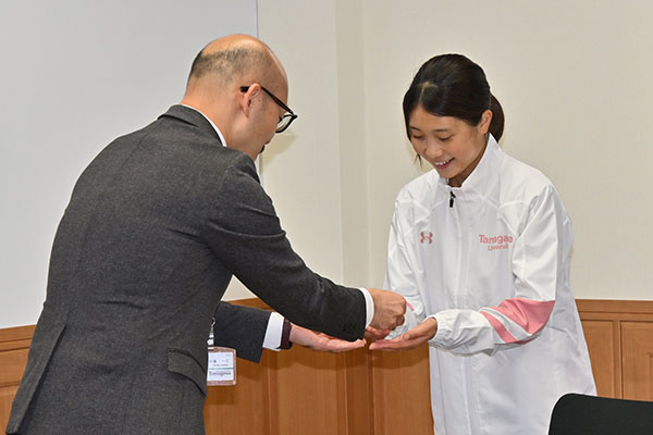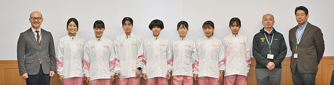 左から、小原一仁学長、女子駅伝チームの隅田美羽キャプテン、佐藤彩乃さん、新明百寿花さん、